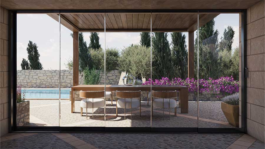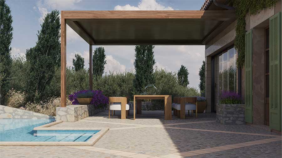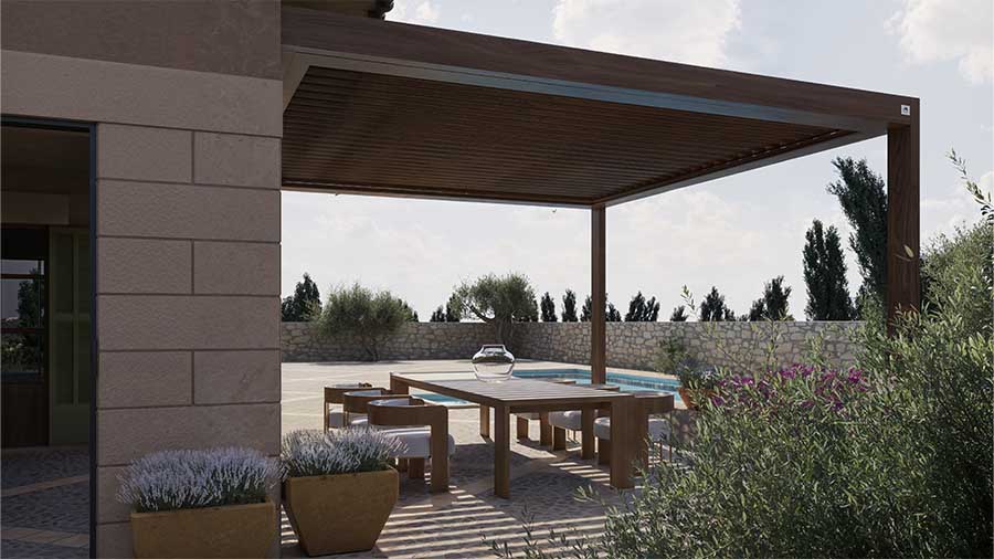 Εγκατάσταση πέργκολας με ηλεκτρικό μοτέρ σε εξωτερικό χώρο κατοικίας