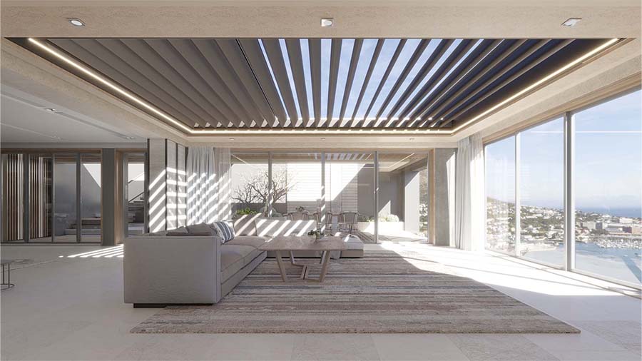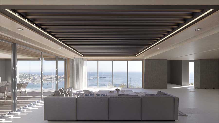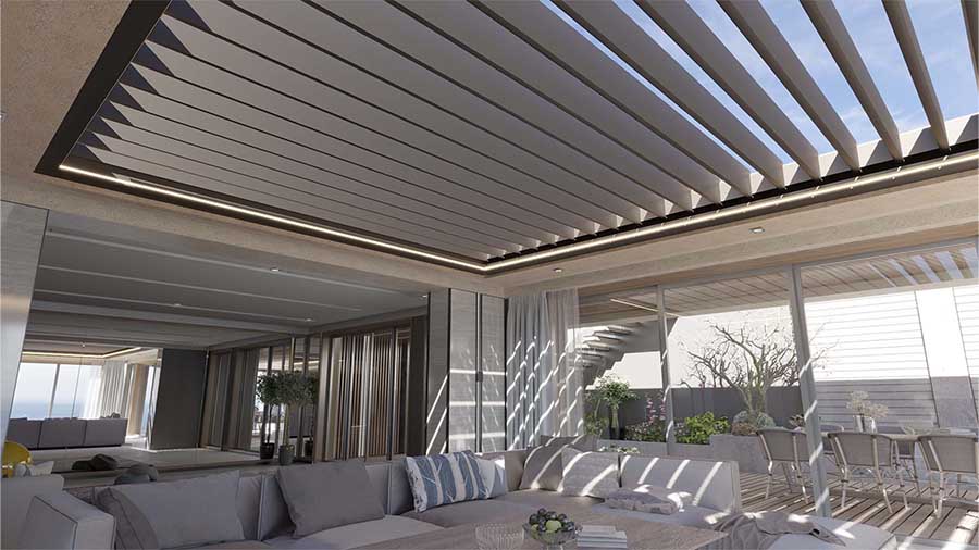 The Infinity pergola system is specially designed to meet the modern needs and demands of users. It has advanced features that make it the ideal choice for protection from intense sun, strong winds and rain. The integrated and hidden water drainage allows for maximum use of the outdoor space, without the stress of water accumulation or leakage on the sides of the system.